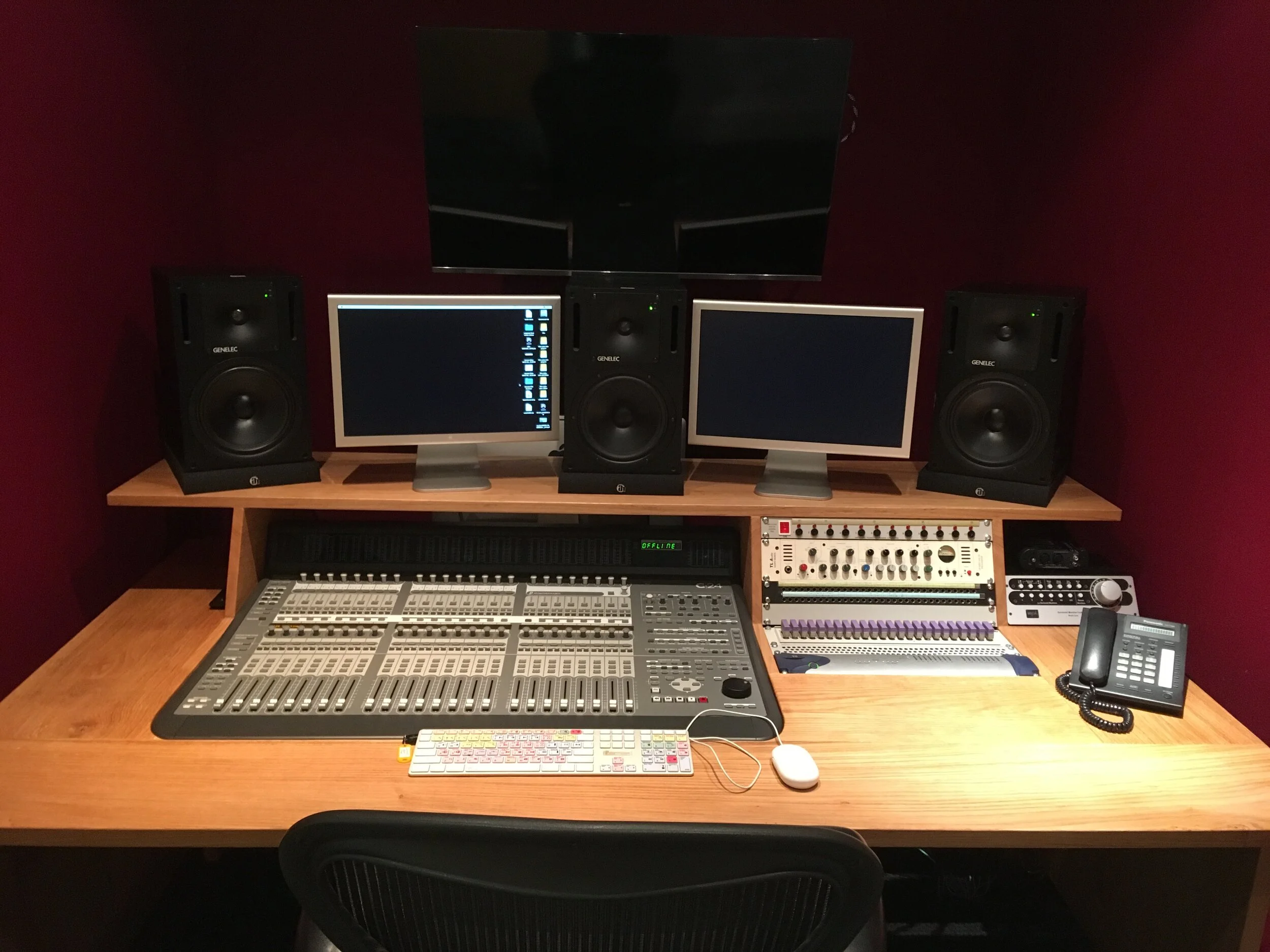 One of three bespoke work stations in oak for Savalas at Film City Glasgow, featuring flush mounted sound mixer and rack equipment.
